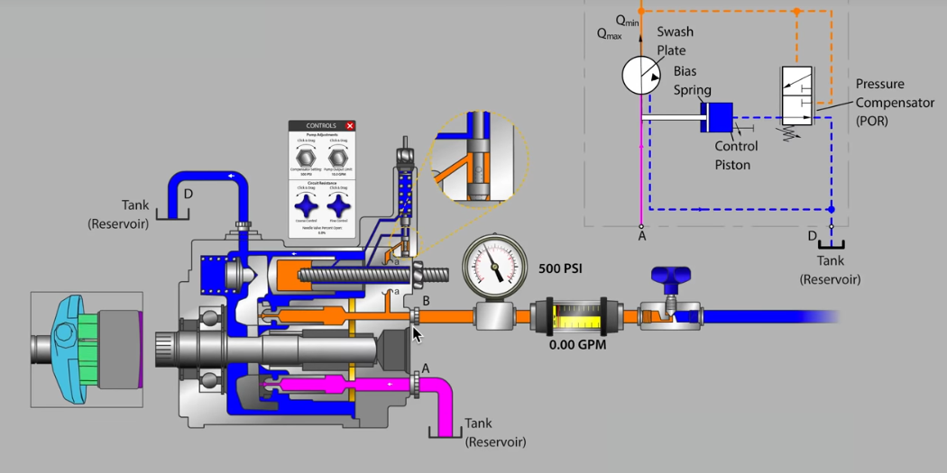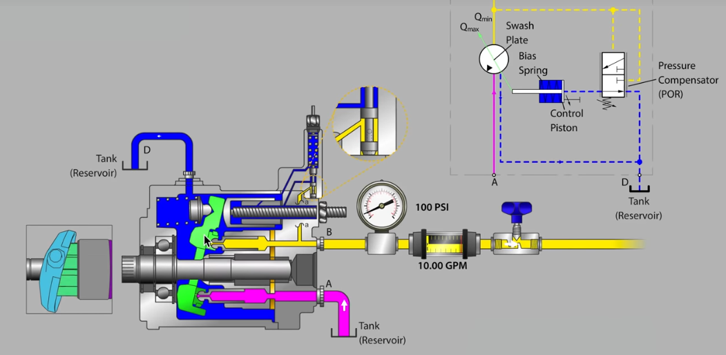 Ngoài ra cơ cấu này liên hệ với cơ cấu chỉnh lưu lượng tự động để cân bằng và ổn định vị trí đĩa nghiêng.Bơm thông minh này tùy thuộc việc cài đặt chế độ chỉnh lưu lượng bơm làm việc theo chế độ đó.Ví dụ chỉnh chế độ công suất không đổi:P*Q =Constant.