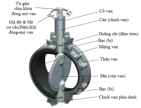 Van bướm điều khiển khi nén là van dùng để đóng mở dong chất lòng trên đường ống có kết cấu được mô tả ở hình dưới đây.