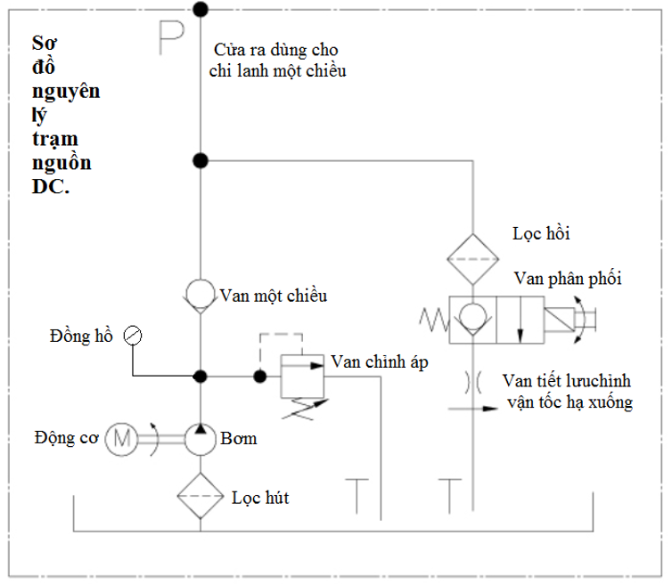 Sơ đồ nguyên lý làm việc mô tả dưới đây được áp dụng rất phổ biến cho bàn nâng hạ, bel đổ hàng và các thiết bị khác hoạt động tương tự.