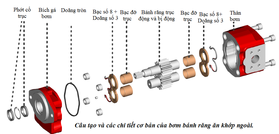 Cấu tạo cơ bản của bơm bánh răng gôm các bộ phận chính được mô tả trong hình dưới đây: