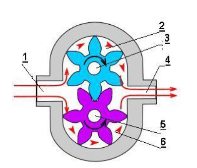 Khi các bánh răng quay tạo nên chân không (từ -0,2 đến -0,5) KG/cm2 (bar) sinh ra lực hút chất lỏng vào các kẽ răng 2;6 (theo mũi tên) trên hình vẽ vànhờ mô men xoắn dòng chất lỏng được nén sang khoang đẩy (cửa ra) của bơm 4 sinh ra áp suất và chuyển năng lượng cơ khí (mô men xoắn) trên đầu trục bơm thành năng lượng chất lỏng.
