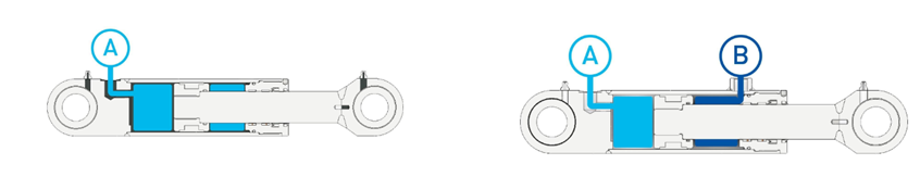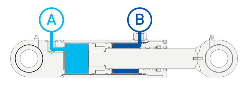 Điều đó có nghĩ là năng lượng thủy lực của xi lanh đã được chuyển đổi thành chuyển động cơ học. Khi áp suất đến buồng A, thanh đẩy ra và do đó lực đẩy ra (F = P x A1). Khi chuyển động ngược chiều trong xi lanh tác động kép khi áp suất đến buồng B, thanh lùi vào trong và lực cũng lùi vào (F = P x A2)