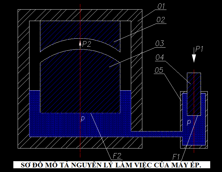 P1 -Lực nén của xi lanh tạo áp p;P2-Lực của máy ép (lực ép);F1- Diện tích mặt cắt của piston 04;F2-Diện tích mặt cắt ngang của chày ép 03.p-Là áp suất tịnh đươc tác động nhờ lực P1.