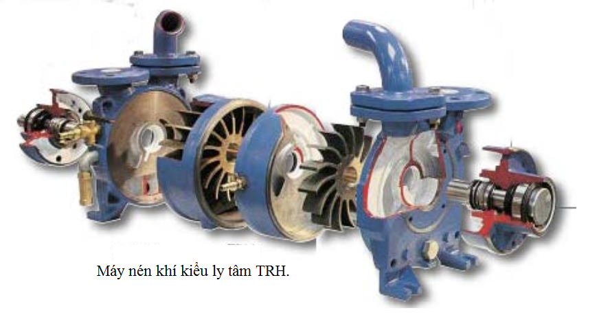 Máy nén khí kiểu ly tâm hoạt động như sau:Khi mô tơ điện quay chuyền năng lượng cho câc cánh của máy nén ,cánh của máy tác động cung cấp năng lượng cho các phần tử khí với một lực văng ly tâm tạo thành dòng chảy khí và được nén vào bình chứa (bình tích)được giữ lại nhờ van chặn là van một chiều cửa đẩy còn khi hút vào thì được chặn lại nhờ van một chiêu cửa hút.Không khí là chất lỏng nén được nên khí nén được chứa trong bình tích tăng áp suất lên tùy theo khả năng nén của máy bơi công suất của mô tơ điện.Bảo vệ bình tích nhờ van an toàn hoặc rơ le đóng-ngắt.Khi vượt quá khả năng van an toàn sẽ mở để xả áp suất dư ra ngoài hoặc rơ le báo tín hiệu ngắt ngừng động cơ kéo máy nén.