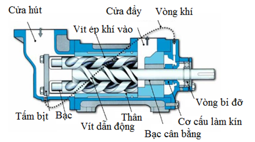 Cấu tạo máy nén khí trục vít được mô tả trong hình dưới đây: