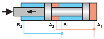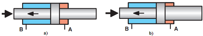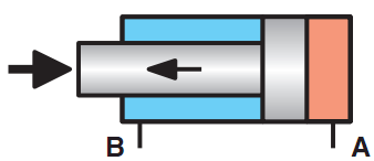 Hình 9.2.b: Áp suất điều khiển đi vào từ cổng B tác dụng lên diện tích vành khăn của piston đẩy cần piston đi về, cần piston đi ra nhờ lực đẩy của lò xo.