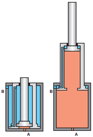 Hình 9.2.c: Áp suất đi vào cổng A sẽ đẩy các piston đi ra từng cái một, áp suất phụ thuộc vào kích cỡ tải trọng và diện tích bề mặt sinh lực của piston, do đó piston nào có diện tích bề mặt lớn nhất sẽ thực hiện hành trình đi ra trước. Nếu áp suất và lưu lượng không đổi thì bắt đầu hành trình đi ra với lực là lớn nhất và vận tốc nhỏ nhất, cuối hành trình lực nhỏ nhất và vận tốc lớn nhất, do diện tích các piston trong quá trình đi ra biến đổi là nhỏ dần.
