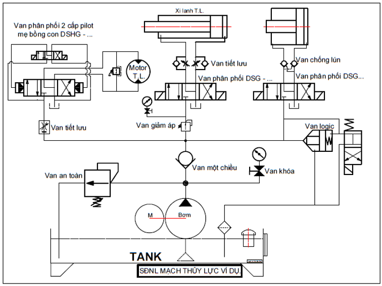 Sau đây là sơ đồ ví đụ mô tả ứng dụng của các van thủy lực của một hệ thống thủy lực: